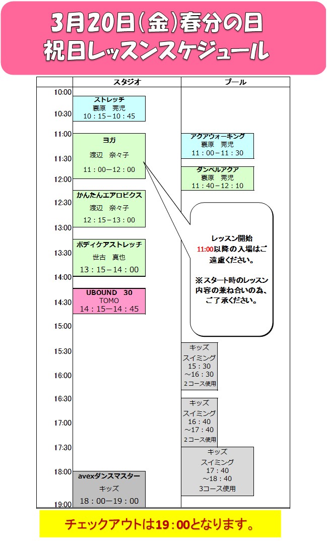 【大人フィットネス】3月祝日スケジュール